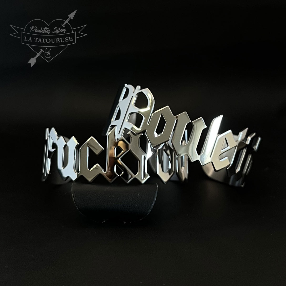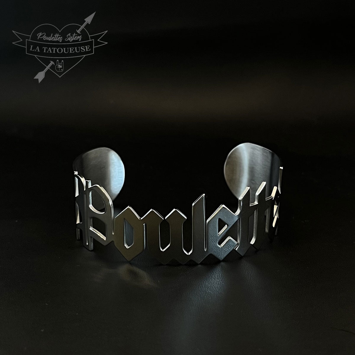 Cette manchette argentée argenté est une pure déclaration de style, née de la collab tatouée entre LA TATOUEUSE DE BIJOUX et POULETTES SISTERS.